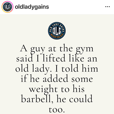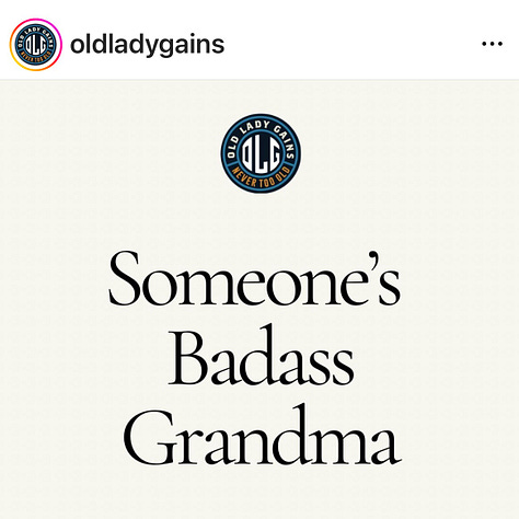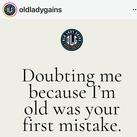 ‘Aging with Attitude’ has also been adopted by a community of women around OldLadyGains apparel company. Its Instagram account showcases inspirational, badass, strong women past their prime and throws some terrific quotes at us.