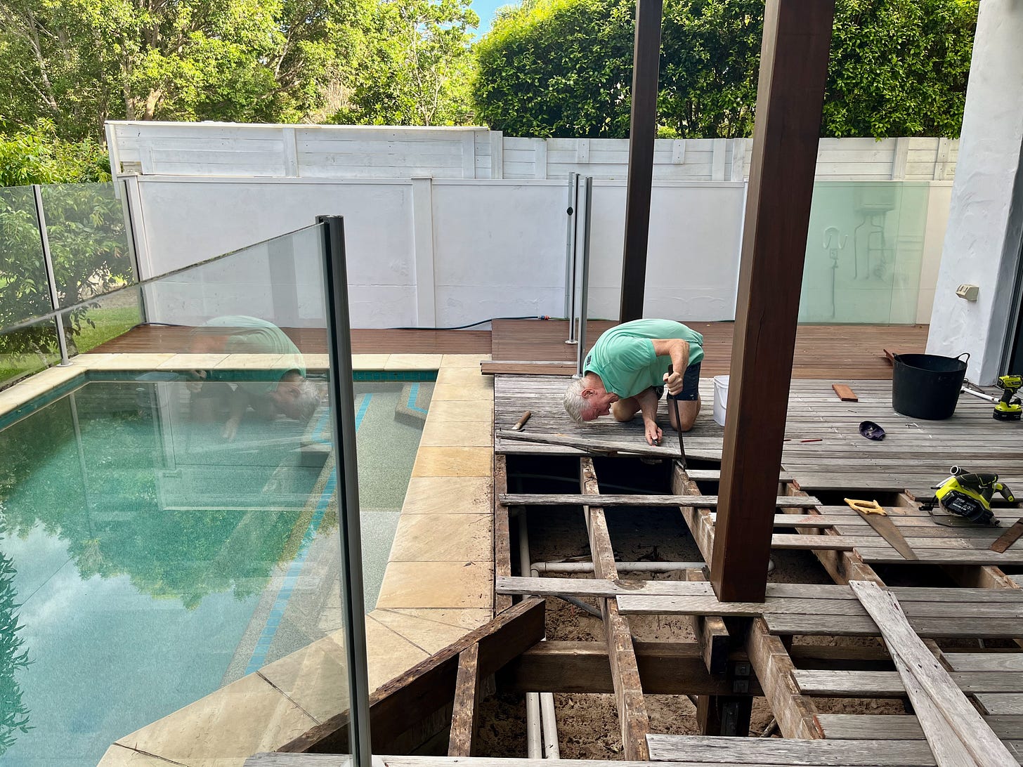 At the moment, he is outside replacing a large section of decking between the house and the pool. Glass fence panels are removed, boards come up, new boards go down, and screws disappear neatly into the timber. It’s a delicate renovation.
