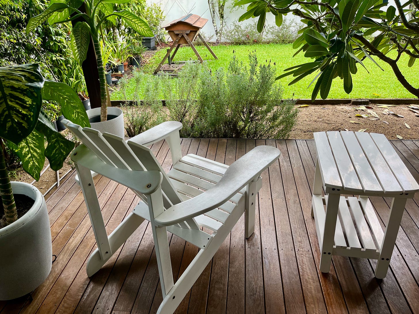 The frangipani tree is in full summer leaf, deep, lush green, giving us shade and privacy from passersby.