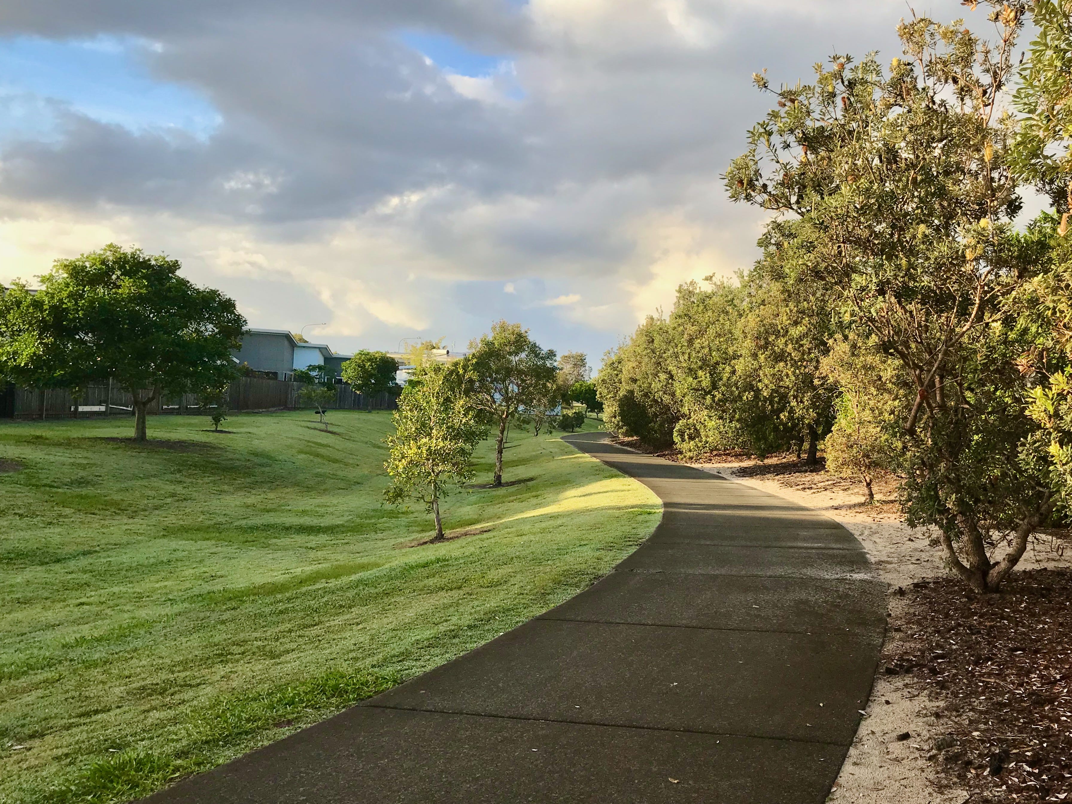 Lorikeets fill the air with loud, insistent chatter from the trees lining the path. Fallen leaves—our version of autumn—lay damp and flattened, pressed into the concrete after weeks of rain. Some have left their imprint behind.